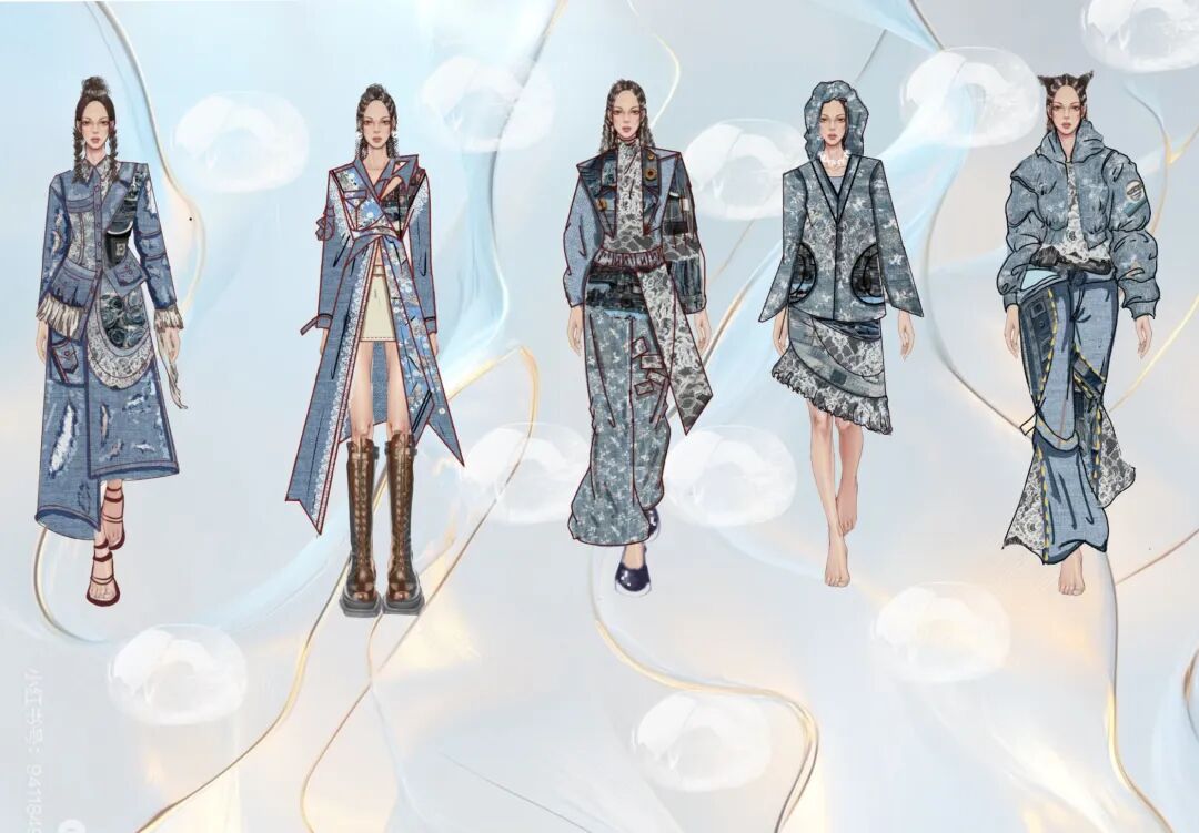 末路逆行者的设计以军装风格为基础,通过独特的色彩和纹理,展现出一种独特的视觉冲击力。同时,废土风的融入,使其具有一种浓烈的氛围以及个性特色。在军装风格元素中运用和创新废土风格,结合拼接手法让牛仔布与其他面料进行搭配,让款式的设计与色彩的碰撞中使整个设计具有功能性、时效性和独特性。