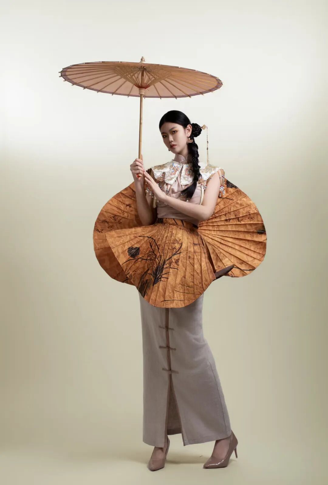 整体造型既保留了传统油纸伞文化的古朴雅致,又融入现代时尚理念,适合在时尚秀场、国风主题活动等场合穿着,让穿着者散发着温婉而独特的东方魅力,是传统与现代交织碰撞出的时尚火花。