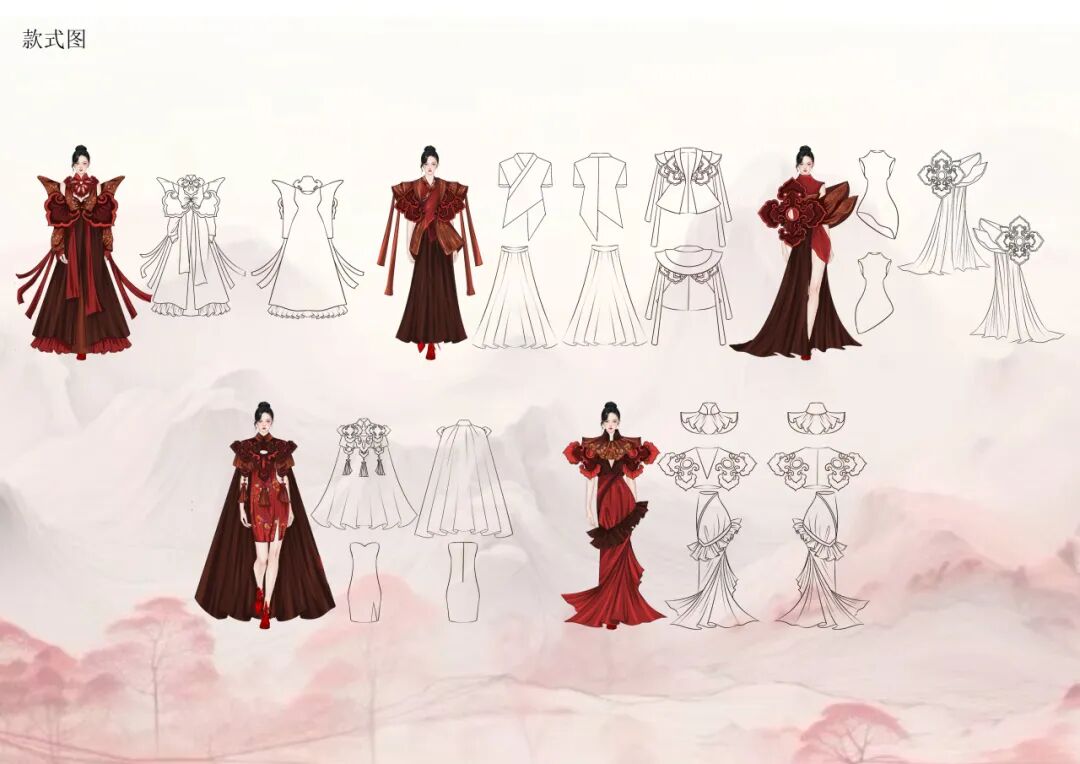 在材质与工艺上面选取轻薄且坚韧的面料模拟油纸伞的伞面质感,运用特殊印染工艺,将传统水墨画中的花鸟、山水图案呈现其上,如同油纸伞上的精美绘饰。精湛的手工盘扣工艺,彰显传统服饰的细腻与考究。上装部分,精致的立领与蕾丝、珠绣相结合,似油纸伞撑开时的优雅轮廓,立领又增添了一份端庄与古典。下装采用简约大气的长裙款式,开叉设计若隐若现露出腿部线条,与上装的繁复形成对比,层次丰富。