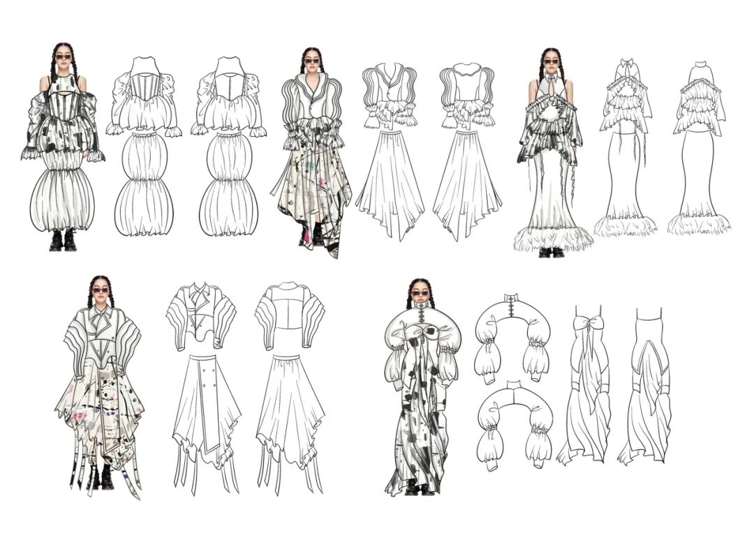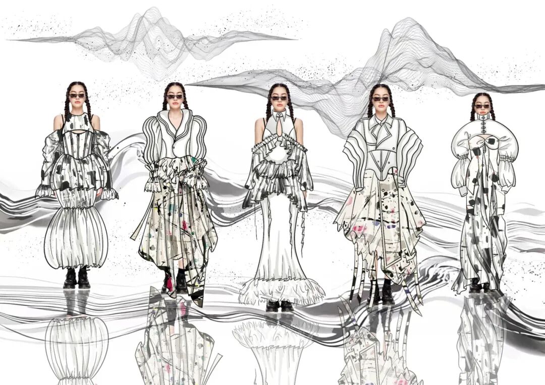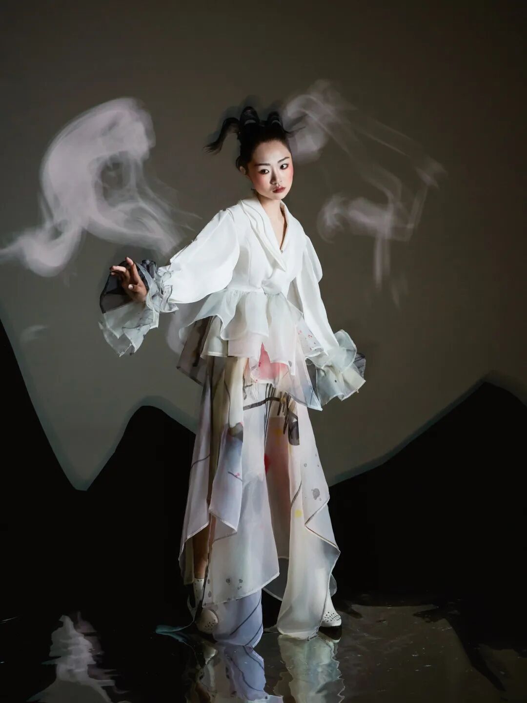 灵感来源于水墨画元素其艺术家吴冠中的绘画,灵活运用点、线和面来与西装解构相碰撞,形象地表达了以线书写春意,纵横交错,上下遨游的新中式风格解构系列女装,展现出跳跃的点和飞扬的线,流洒出盎然春意的面,体现出中国绘画与新式风格的西装融合结构系列女装。
