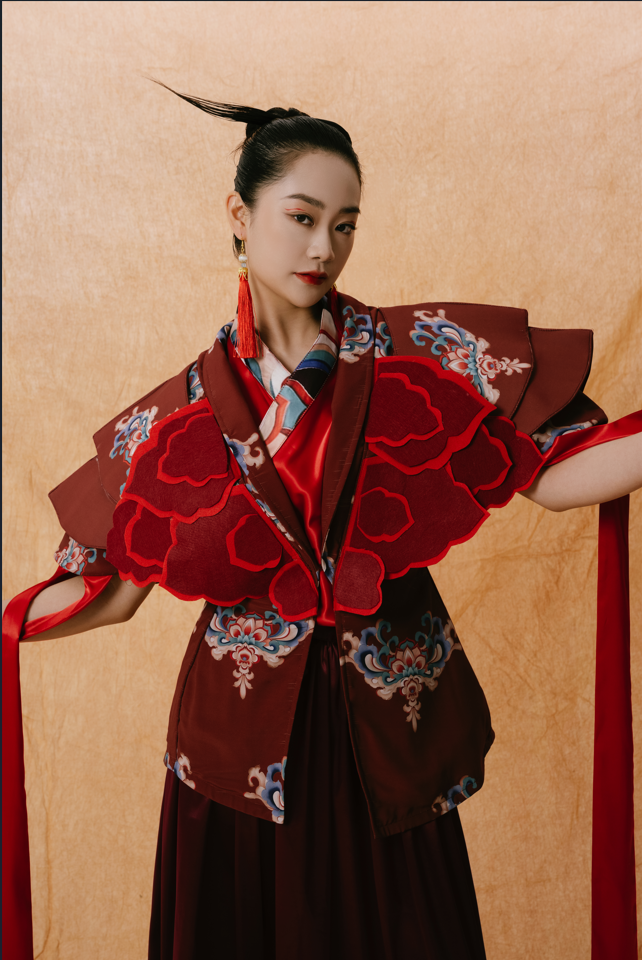 以四合如意式云肩为灵感来源,提取“吉祥如意、四方合一”的文化内涵,结合现代审美进行重构。将云肩的传统四合结构进行拆分,重塑云肩的整体结构,使其不局限于肩部的装饰,而是延伸至胸、腰部等将云肩以超大且立体的形态展现,保留如意云纹轮廓的同时,扩大其尺度,使之成为视觉核心,增加了服装的时尚性与适应性。在云肩质感上进行了突破,选用质地厚实且挺括的毛毡,能让四合如意式云肩轻松塑造出夸张、立体的造型。