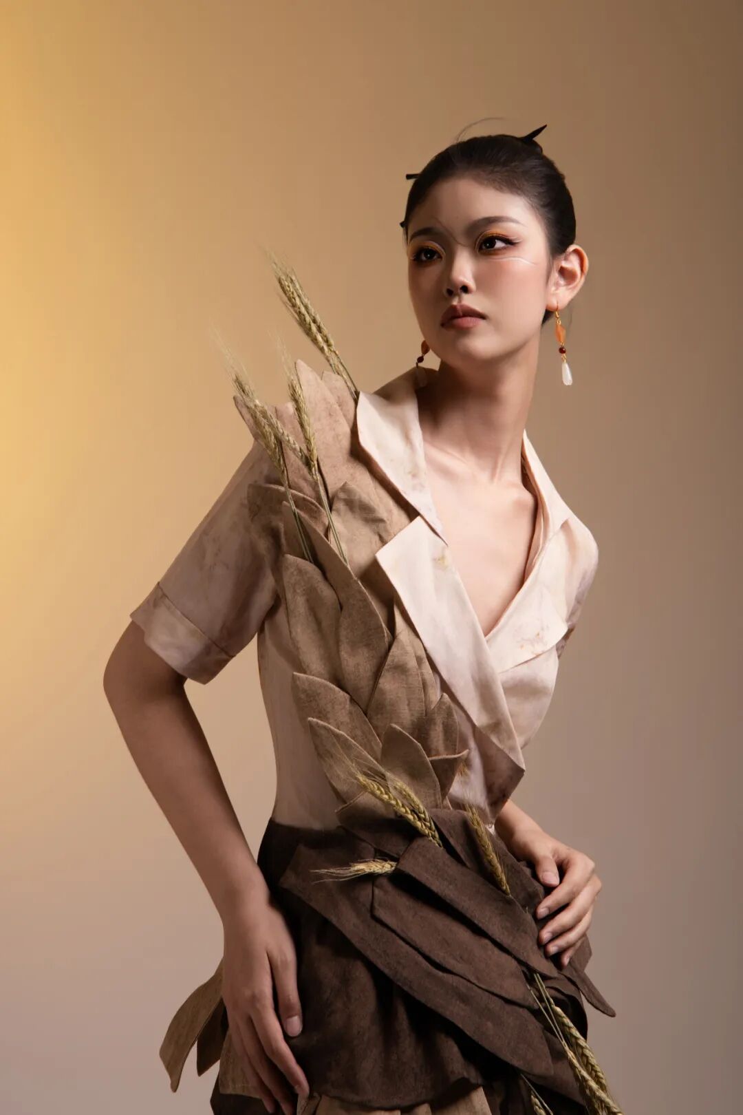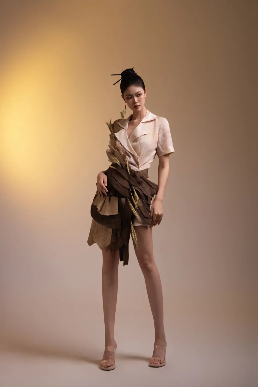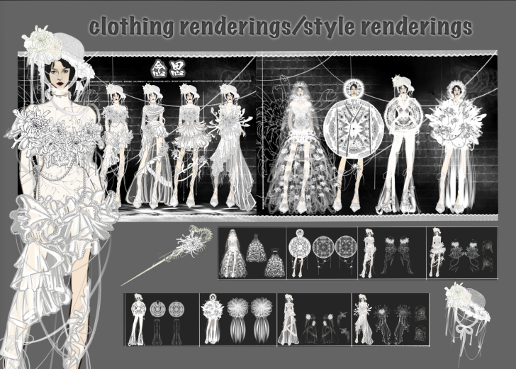 第四套服装采用分体设计,上衣部分设计了高领座与头齐平,两个黄金螺旋线条做肩部设计,袖子采用泡泡袖设计,三层外摆,主体采用提花面料,装饰立体花朵肩部装饰两朵大花,呈现出花朵在身体上绽放的惊艳感,下身采用前后两片的设计,前片捏褶设计,后片婚纱缎复合特殊面料做三米长拖摆,设计雕花喷漆后装饰在前片,不仅使传统材质焕发出新的活力。让新型材质也可以与维多利亚时期的服装元素相结合。用于制作服装的配饰或局部装饰,增加服装的现代感和时尚感。