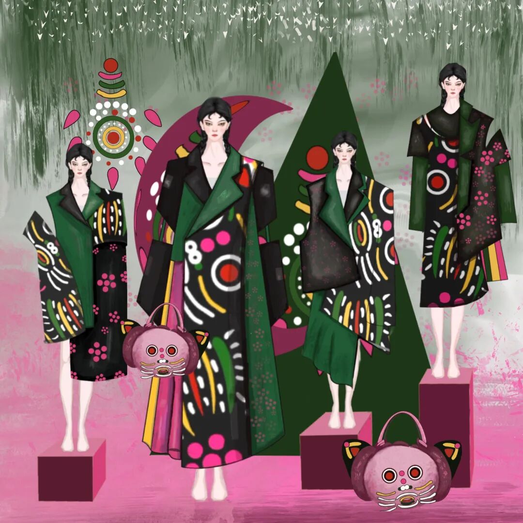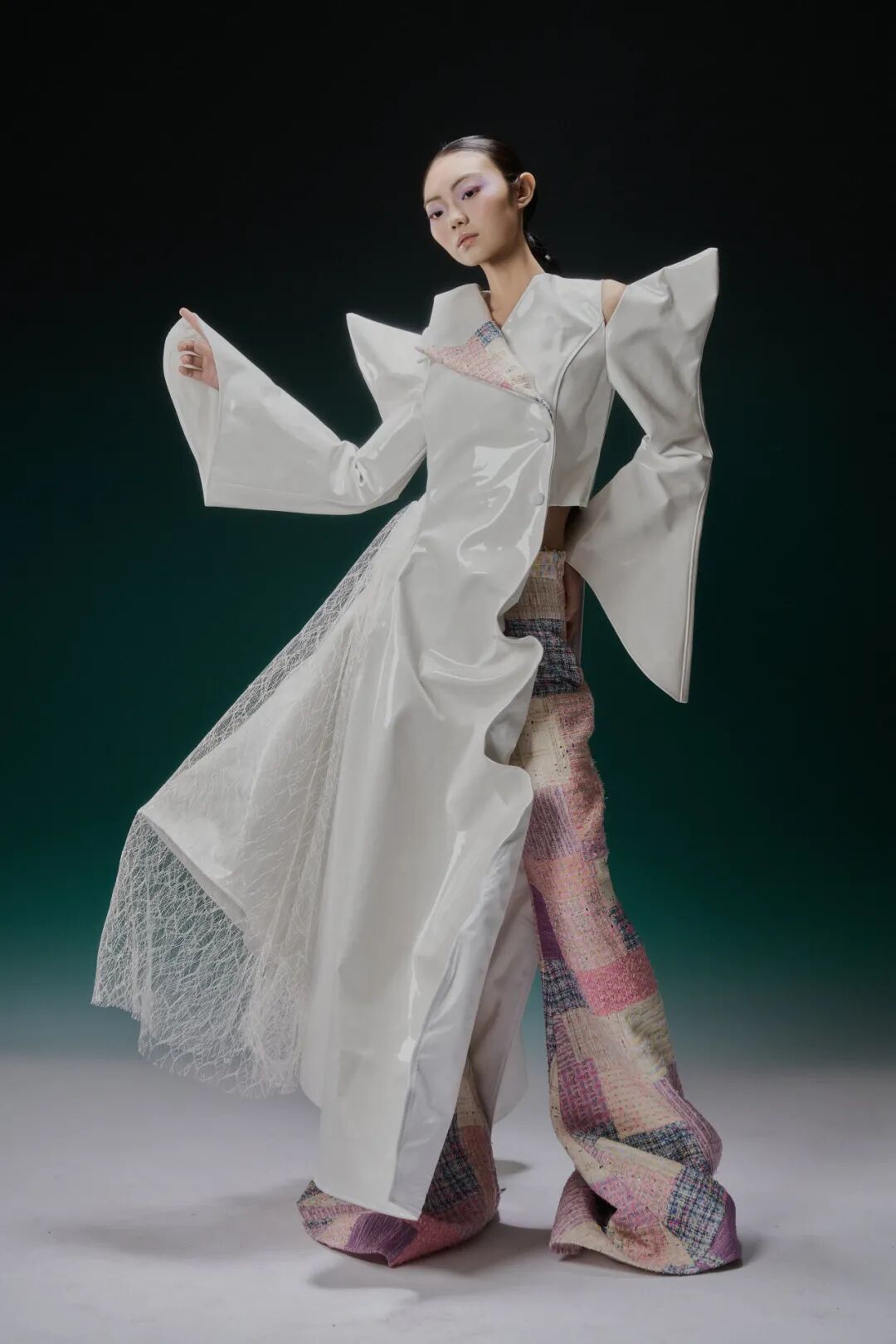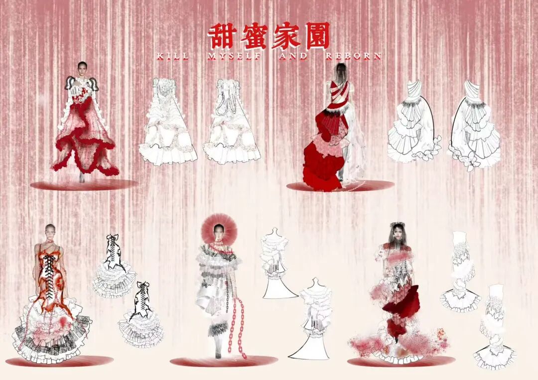 本设计的第一套衣服运用拉夫领作为头部装饰,披肩部分选择压褶工艺,突出维多利亚时期服装的华美特点,披风下摆处多层抽褶工艺,点缀羽毛元素,行动间不失灵动。增加了服装整体的精致度。下装部分是白色长裤,腰间点缀立体花朵与流苏制成的腰带,裤子通体采用提花面料,裤兜外扩夸张的廓形,点缀羽毛,下摆缝合三层蕾丝花边,展现出 完美的腿部线条,简洁流畅,服装整体色彩一脉相承,不失维多利亚时期服饰的繁复又时 尚与现代感兼存,便于穿脱行走。