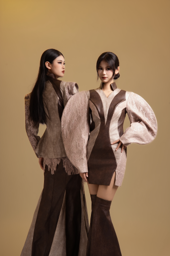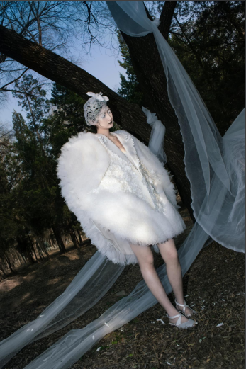 第二套衣服上衣部分,采用两件套设计,即复古胸衣加斗篷式里衣,采用高领口设计,里衣部分选择带有金线的白色面料,胸衣插入鱼骨,保留了维多利亚时期的设计风格,胸衣上下点缀白金相间的羽毛,与整体搭配呼应,突出腰身,展现出维多利亚时期的浪漫与现代的简约之美。下装部分采用婚纱缎复合蕾丝面料,葫芦形裙型贴合臀部,插入钢架结构使得裙型非传统意义上的 A 字裙,而是呈前后扁平、左右横宽的椭圆形,下摆收紧后外放呈现鱼尾拖摆,工字褶缝纫三层蕾丝花边。裙摆设计得简洁流畅。
