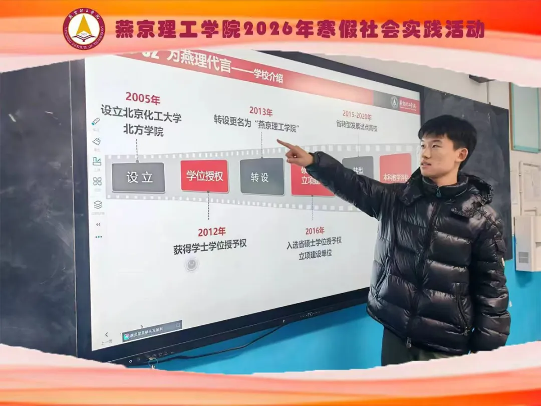 为引导青年学子在服务家乡中锤炼过硬本领,在躬身实践中展现青春作为,燕京理工学院艺术学院于2026年寒假启动以“情系母校,筑梦未来”为主题的专项社会实践活动。学院积极动员学生返回家乡故里,通过开展社区志愿服务、企业见习调研、文化传承宣讲等方式,与家乡群众展开深度互动。学子们以“建设者”的视角,结合自身在大学期间的专业积累与创新视野,生动讲述燕理故事,用心参与基层治理,在家乡热土上挥洒汗水,在回报桑梓中书写青春担当。