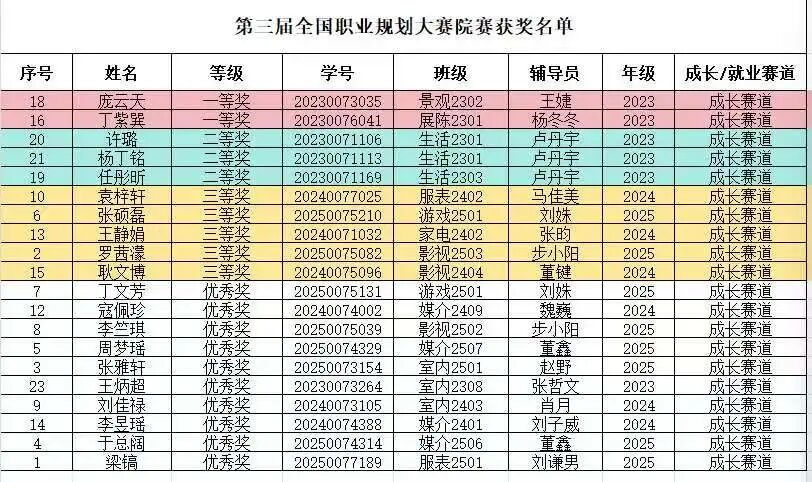 近日,燕京理工学院艺术学院第三届全国大学生职业生涯规划大赛院赛圆满落幕,获奖名单正式面向全院公示。此次大赛以“科学规划职业人生”为主题,旨在唤醒学生职业生涯规划意识、锻炼综合规划能力,营造良好尚学氛围,将学院育人理念与实践教学深度融合。众多学生积极参与,通过专业阐述与沉着答辩展现清晰逻辑与前瞻视野,充分彰显了扎实的专业素养与明确的发展方向。 第三届全国大学生职业生涯规划大赛 院赛获奖名单 恭喜以上获奖同学!愿大家以此次获奖为契机,持续打磨职业技能、明晰发展路径,在艺术领域与人生赛道上稳步前行。也期待全院学子以获奖同学为榜样,主动规划未来、勇于探索实践,在青春的赛道上绽放属于自己的光彩!期待同学们能带着院赛积累的经验与底气,在后续校级比赛中再接再厉、突破自我,以更专业的规划、更从容的姿态角逐更高荣誉,为学院争光添彩! 下一步,学院将持续深化职业生涯教育,为学生精准对接行业需求、实现高质量就业创业赋能蓄力。更多赛事后续动态,敬请关注学院官方平台! 采编文案 | 景观2403廖怡然 网络运营 | 媒介2403张子萱 责任编辑 | 影视2304曾令晋 指导老师 | 陈建文 王娱